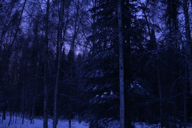 Sun setting behind the spruce trees at around 3:30 p.m. (Come back, light, please?)