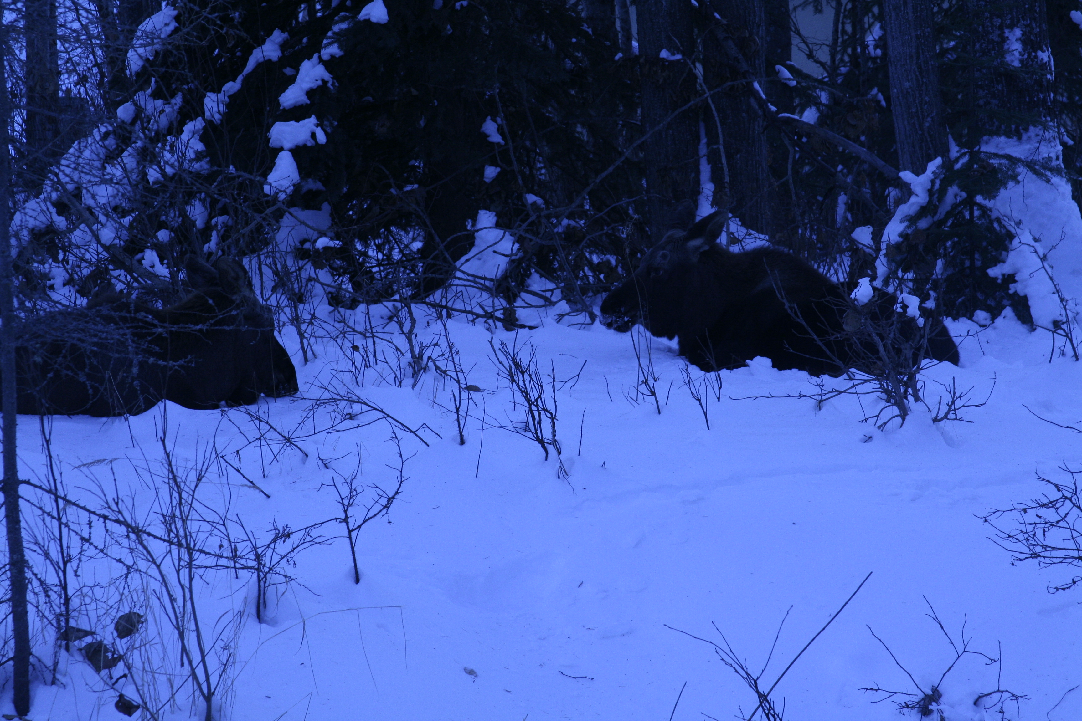 Last night we took a walk along the Coastal Trail around 10 p.m. The air was cold and our breaths fogged and the frozen inlet breathed around us and everything was hushed and still. On the way back we saw two moose down by the creek eating brush and we leaned over the bridge and watched them. They stared momentarily and resumed eating. They didn’t give a damn about us and that made me happy. I like knowing, as I sit here in my writing room late at night with my artificial light purring, that outside moose wander in a world of primitive thoughts and urges, in a landscape I’ll never fully know or see or feel. Such knowledge makes me want to write, so I suppose that I’m also motivated by moose.