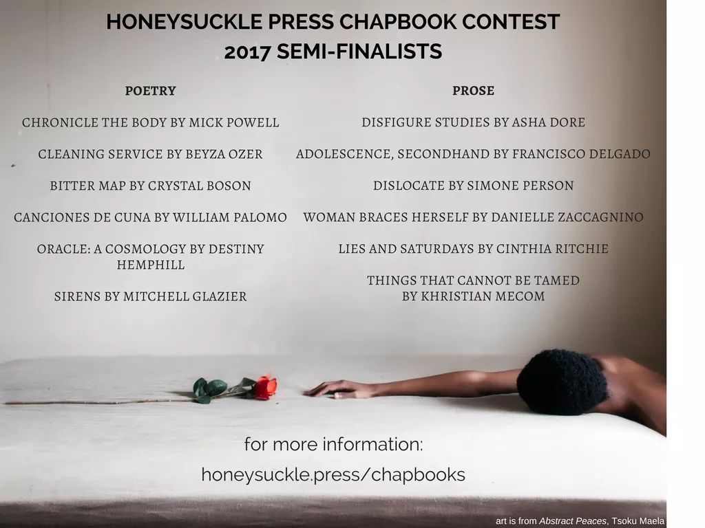 Semi-finalist chapbook excerpt and interview up at Honeysuckle Press